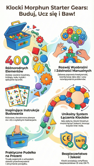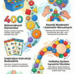 Dołączone do zestawu instrukcje w formie kolorowych dwustronnych kart A4 oraz A3 z kolorowymi i czytelnymi dla dzieci ilustracjami, są nie tylko świetnym wsparciem w nauce pierwszych kroków w budowaniu, ale także inspirują do tworzenia zaawansowanych konstrukcji, takich jak pojazdy, zwierzęta czy budowle. Korzystając z nich, dzieci mogą znacznie poprawić swoje zdolności manualne, poćwiczyć koordynację ręka – oko, skupienie oraz umiejętność rozwiązywania problemów.