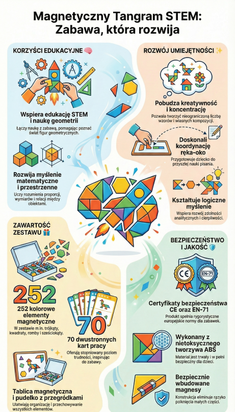 Magnetyczna układanka z 252 kolorowymi kształtami geometrycznymi i 70 kartami pracy. Rozwija logiczne myślenie, kreatywność i umiejętności matematyczne. Dla dzieci 3+. Bezpieczne, certyfikowane. Zabawa i nauka w jednym!