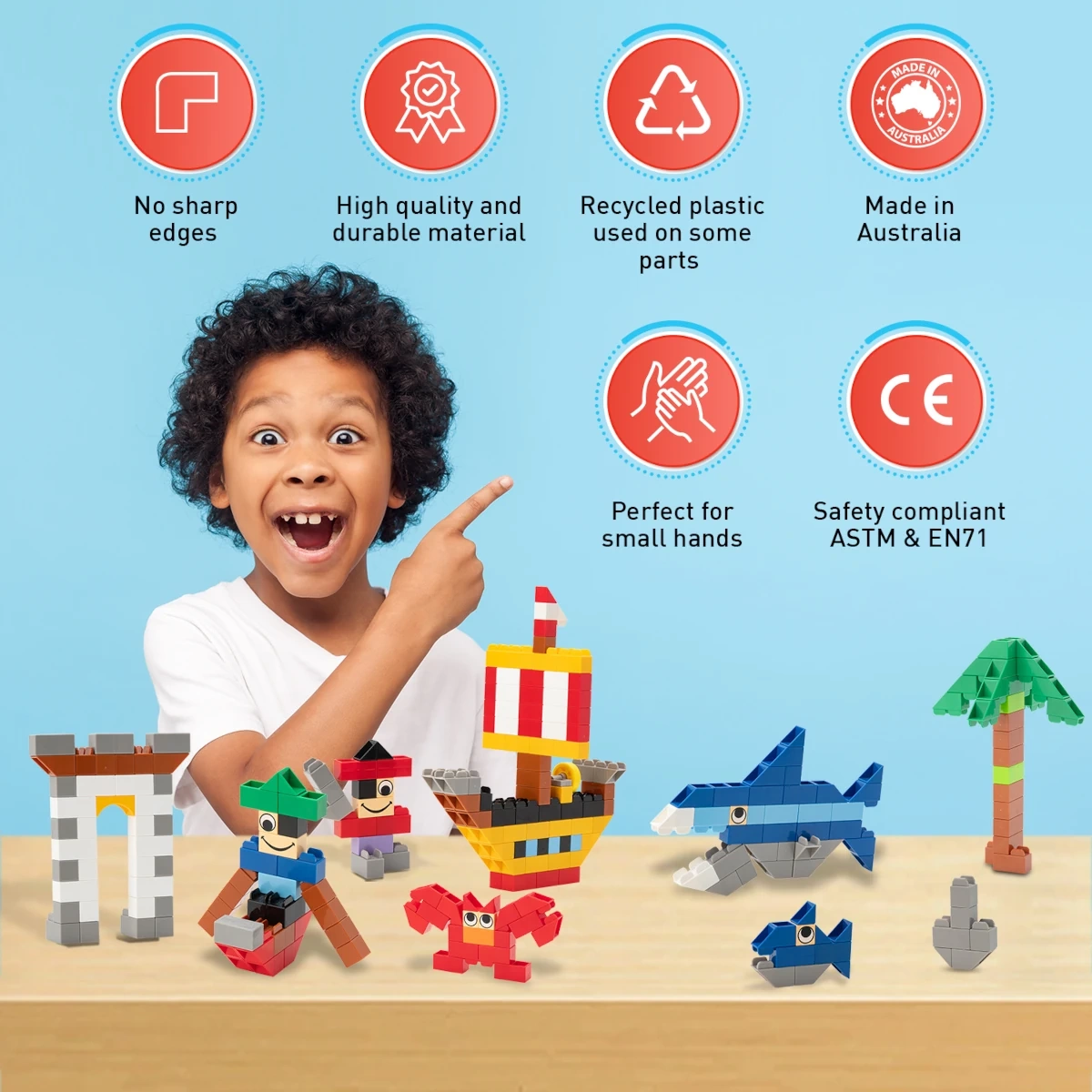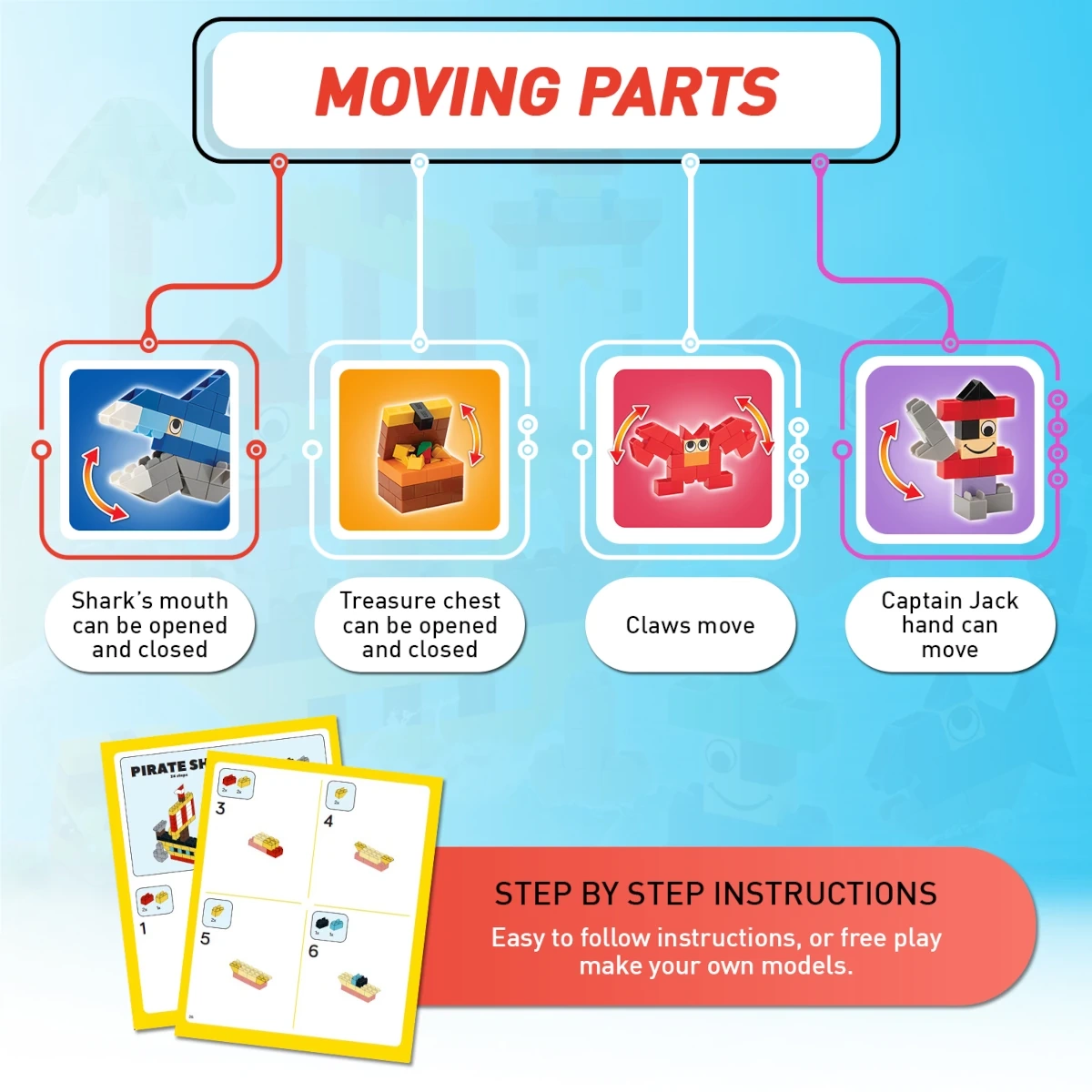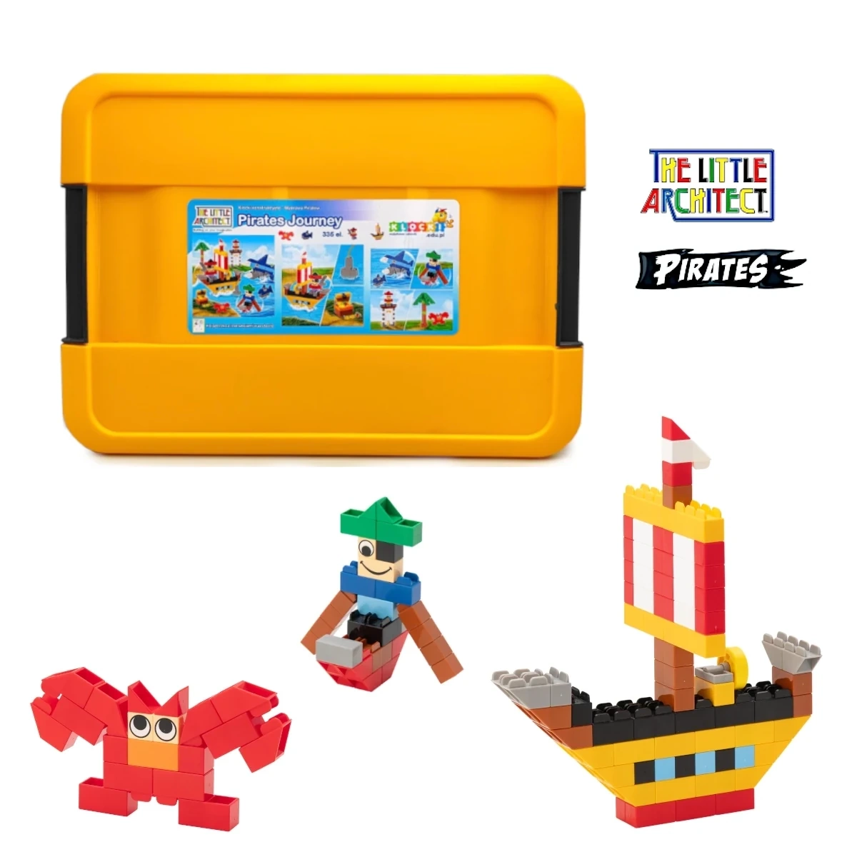 Zestaw The Little Architect Pirates przenosi dzieci w świat morskich wypraw, skarbów i dzielnych kapitanów. To 335 kolorowych klocków konstrukcyjnych, które pozwalają tworzyć statki pirackie, tropikalne wyspy, rekiny, postacie piratów i wiele innych modeli. W zestawie znajduje się także książkowa instrukcja A4 z przejrzystymi, kolorowymi schematami budowy.